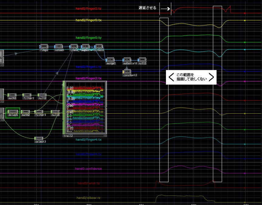 leap motionの難点としてセンサー範囲/現在の手の位置が描画が始まらないとわからない・・・結果、範囲外→0の位置までの移動が恐る恐るゆっくりになるか、急(数コマ以内)の移動になってtrace SOPで残像残っちゃうなんてことになったので、レスポンスは犠牲になりますがdelay CHOPを挟んでこの問題を解決してます。