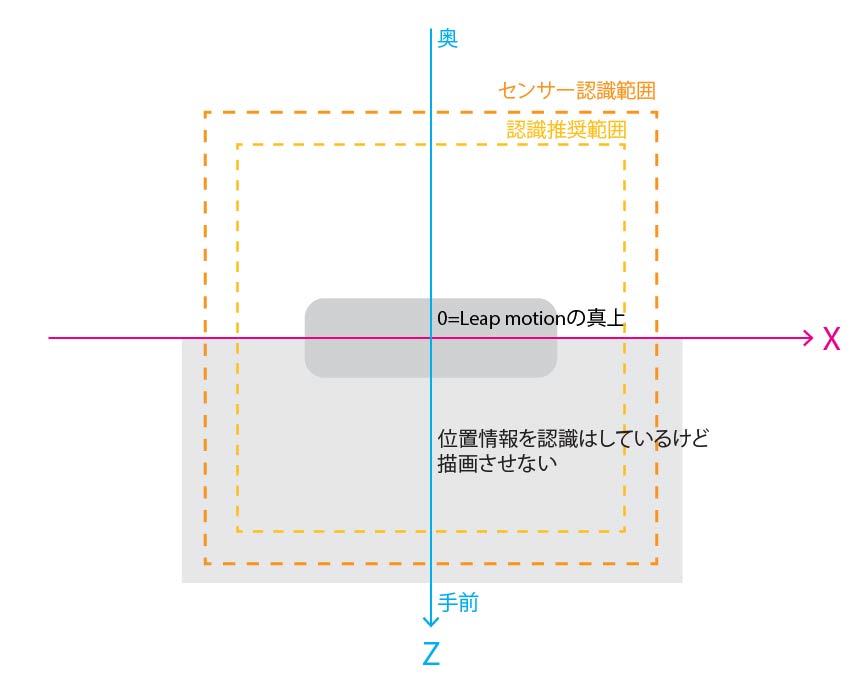 任意の指or手のひらなどの位置+傾きでやったほうが軽そう・・・ - Leap Motion本体を基準に手前プラス、真上0、奥マイナス値になるから当初予定のZ軸位置=サイズ大小がデフォルトではできない・・・