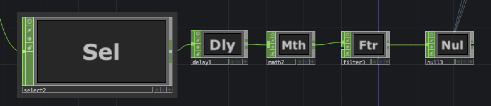 leap motionの難点としてセンサー範囲/現在の手の位置が描画が始まらないとわからない・・・結果、範囲外→0の位置までの移動が恐る恐るゆっくりになるか、急(数コマ以内)の移動になってtrace SOPで残像残っちゃうなんてことになったので、レスポンスは犠牲になりますがdelay CHOPを挟んでこの問題を解決してます。